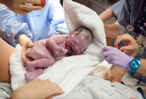 Hubby says, “This delivery was a very difficult and a very special experience for me. While Laura was feeling torn in two physically, I felt like I was being torn in two emotionally. It was killing me to see her go through such difficult contractions and perceive the pain that she must have been feeling during the final moments at the delivery. But, at the same time I was so excited and overjoyed when I got the first glimpse of our beautiful little baby girl. I’ll never forget seeing that little tuft of hair followed by that purple little face. By the time the rest of her was out my eyes were so filled with tears that I could barely even see her. What an incredible and emotional experience that I will certainly never forget.”