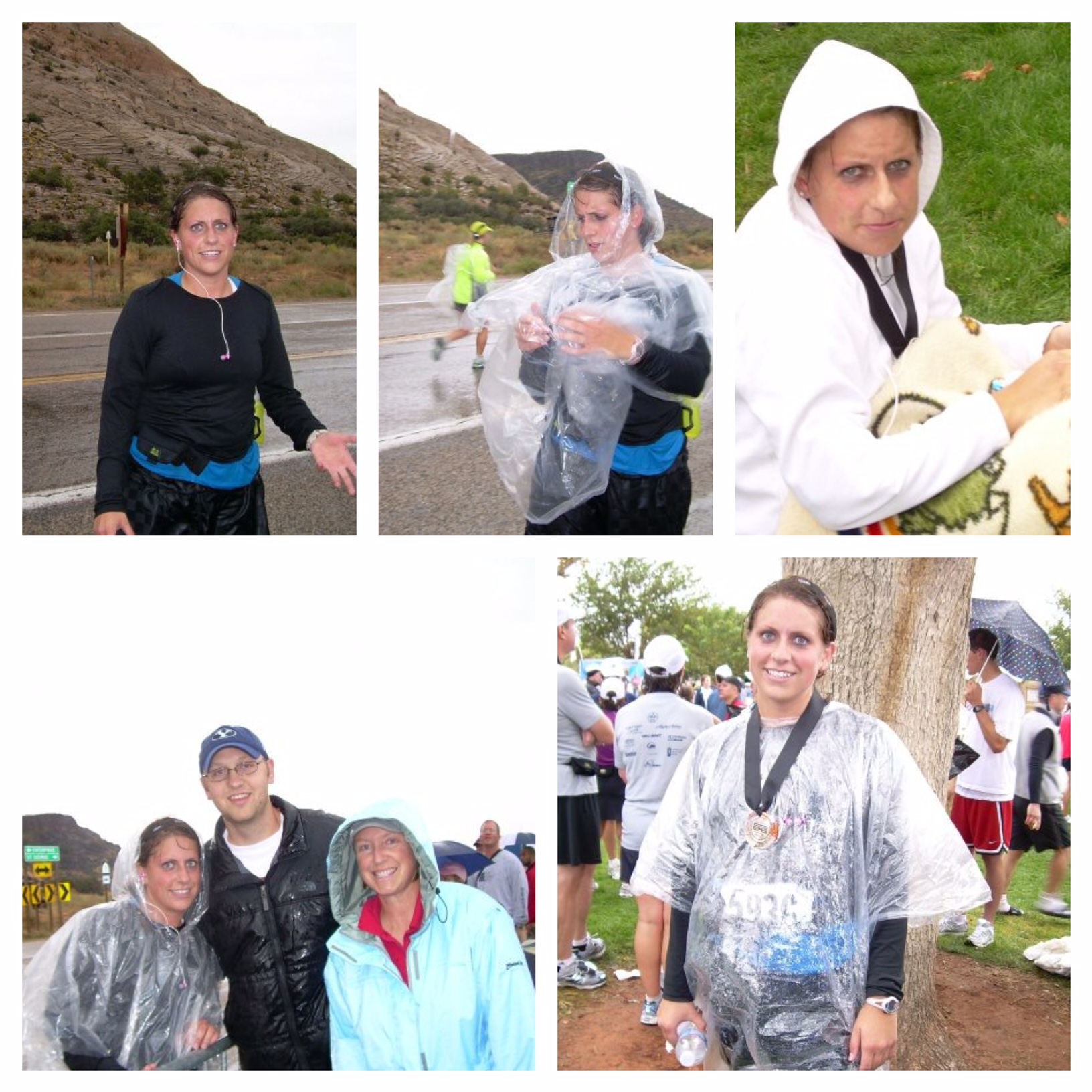 Marathon weekend came, my mom came down with me and we stayed at a friends house. We drove the course the night before. Being new to this running thing, I didn’t look up elevation and had no idea how to actually pace myself or feed my body for such a long run! I just figure I would do what I had been doing on my training runs. I think I slept a total of 20 minutes the night before! Between nerves and the baby cows next door that just left their moms and were crying all night! I got out of bed at 3am got dressed, got my water belt with 4 water bottles, my iPod nano, and a bag of peanut butter. My mom dropped me off at the buses. It was cold and raining! I got up to the top and I huddled by a fire until it burnt out because of the rain. The race started, by mile 6 everyone was drenched! I saw my mom and friend at around mile 14 where they put a garbage bag on me and we took a photo. I felt pretty good still. Somewhere before I saw my mom and friend, I had lost one of my water bottles on my belt. I still have no idea what I was thinking to carry that huge thing! They have water on the course! I continued on and about mile 22 is where I realized, this is the farthest I’ve run in my entire life!! I couldn’t believe it! I was going to finish a marathon! My shoes were filled with water but I didn’t care I was going to finish! When I crossed the finish line at a time of 4 hrs 34 minutes my mom was there to see me! My goal was 4hrs 30min so I get great about that! She found me and I was able to take off some of my wet clothes. I probably could have rung my clothes and shoes out and filled up an entire bucket of water! My mom gave me her jacket and a blanket. I went and just sat on the grass trying to stay warm. I happened to be sitting pretty close to where they were giving out ice cream. I probably sat and stared at it for 10 minutes wondering who in the world would ever think Ice cream would taste good after a marathon!! I decided to give in. At that moment it was the best thing I’ve ever eaten in my life! That’s how good it was! The next 4 days I couldn’t walk! Now, here I am today, running a half marathon every weekend and last Sept qualified and went to Boston this April! What can I say, I must Love running!